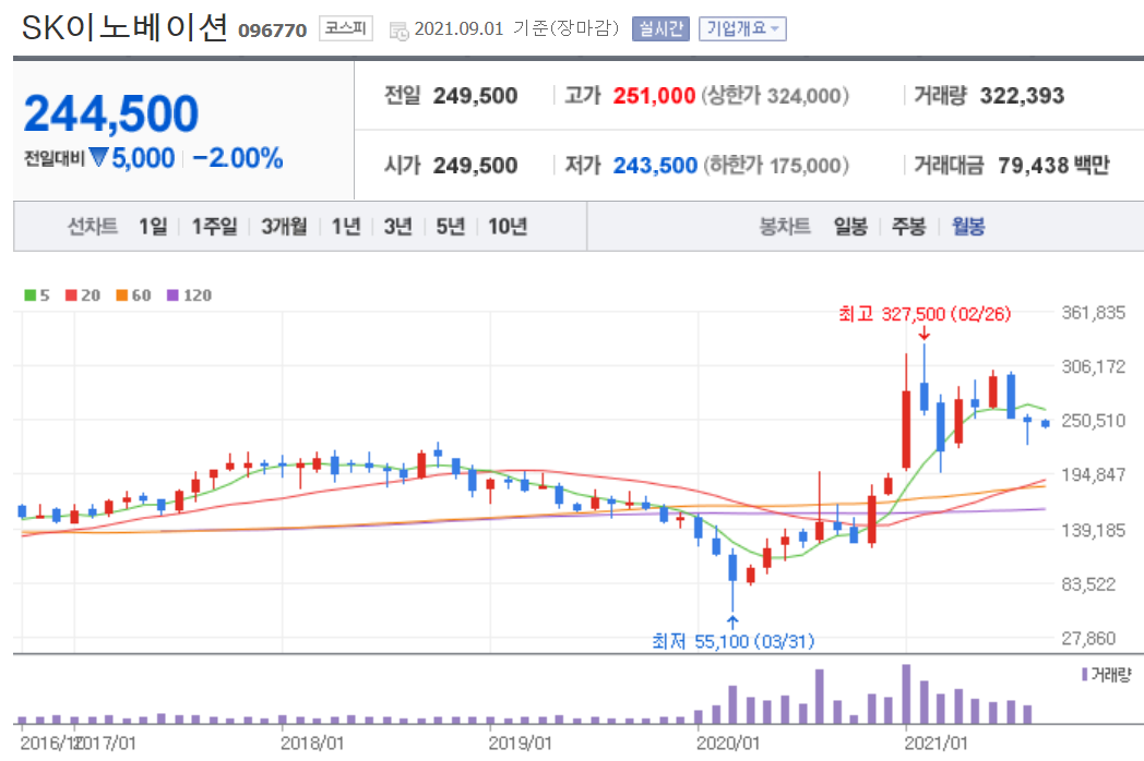 올해 초 SK이노베이션은 배터리 주의 대장주로 불과 1달 만에 주가가 2배가 상승했습니다. 많은 투자자들은 SK이노베이션이 이차전지 종목 중에 가장 큰 성장성을 지닌다고 평가했습니다.