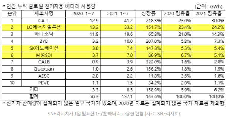 이 과정에서 SK이노베이션은 삼성SDI를 추월하여 글로벌 전기차용 배터리 5위에 입성하게 되었습니다. 2021년 전기차용 배터리 점유율은 5.4%로 전년대비 0.1% 상승했습니다.