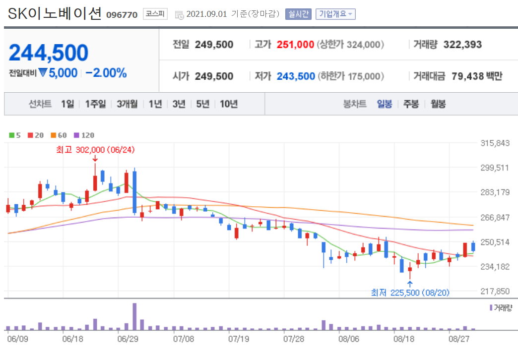 그러나 올해 2월 중순부터 주가가 급락하기 시작하면서 현재는 박스권을 유지하다가 다시 하락 구간에 있습니다. 8월에 좋은 기사들이 계속 나오고 있지만 SK이노베이션의 주가는 큰 반등을 주지 못하고 있습니다.