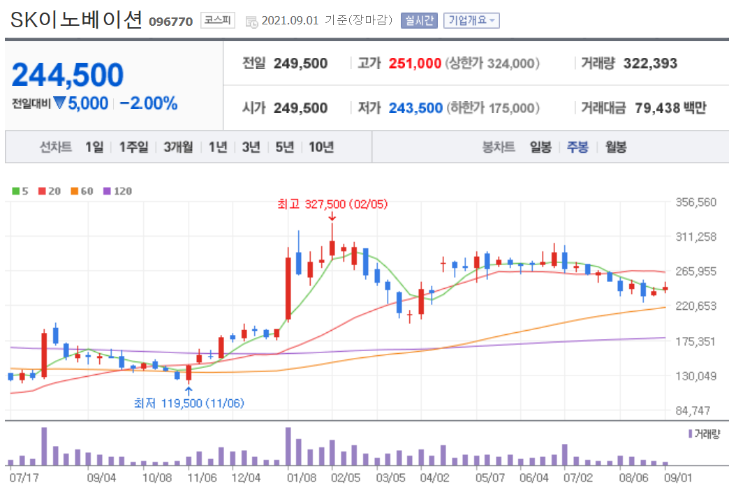 그러나 주가 하락 요인도 존재합니다. SK이노배이션은 SK배터리 사업을 10월에 분사할 예정입니다. LG화학이 LG에너지솔루션을 분사한 것과 동일한 개념입니다.