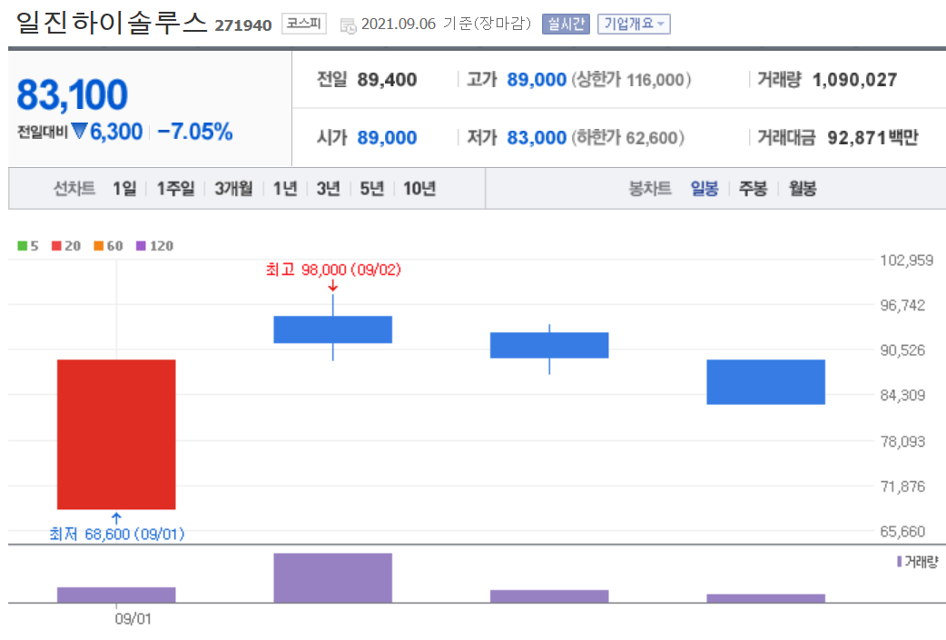 현대중공업이 상장하면서 몇몇의 기업들이 수혜를 받을 것으로 보입니다. 제가 생각한 종목은 일진하이솔루스입니다. 일진하이솔루스는 현대중공업과는 다른 업종이지만 같은 수소 저장 탱크를 개발하고 있다는 점에서 주목을 받을 수 있다고 생각합니다.