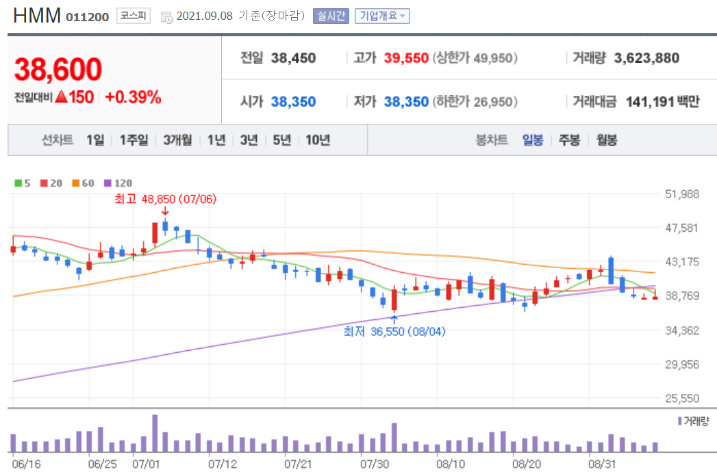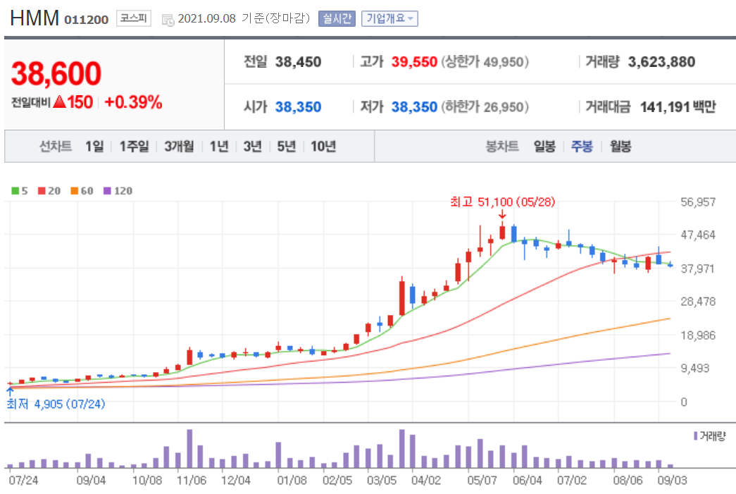 가장 관심 있게 보는 종목은 현대상선입니다. 우리가 잘 알고 있는 HMM이죠. HMM은 현재 파업 이슈로 주가가 조정을 받고 있습니다. 그러나 일봉과 주봉상으로 보면 하락은 상승에 비해 과도하지 않다고 보입니다.