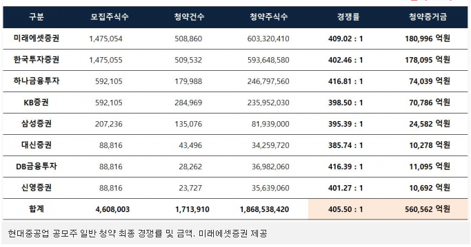 비례 배정과 균등배정을 포함한 증권사별 청약 경쟁률은 하나금융투자가 416.81대 1로 가장 높았습니다. 그리고 대신증권이 385.74대 1로 가장 낮은 경쟁률을 기록했습니다.