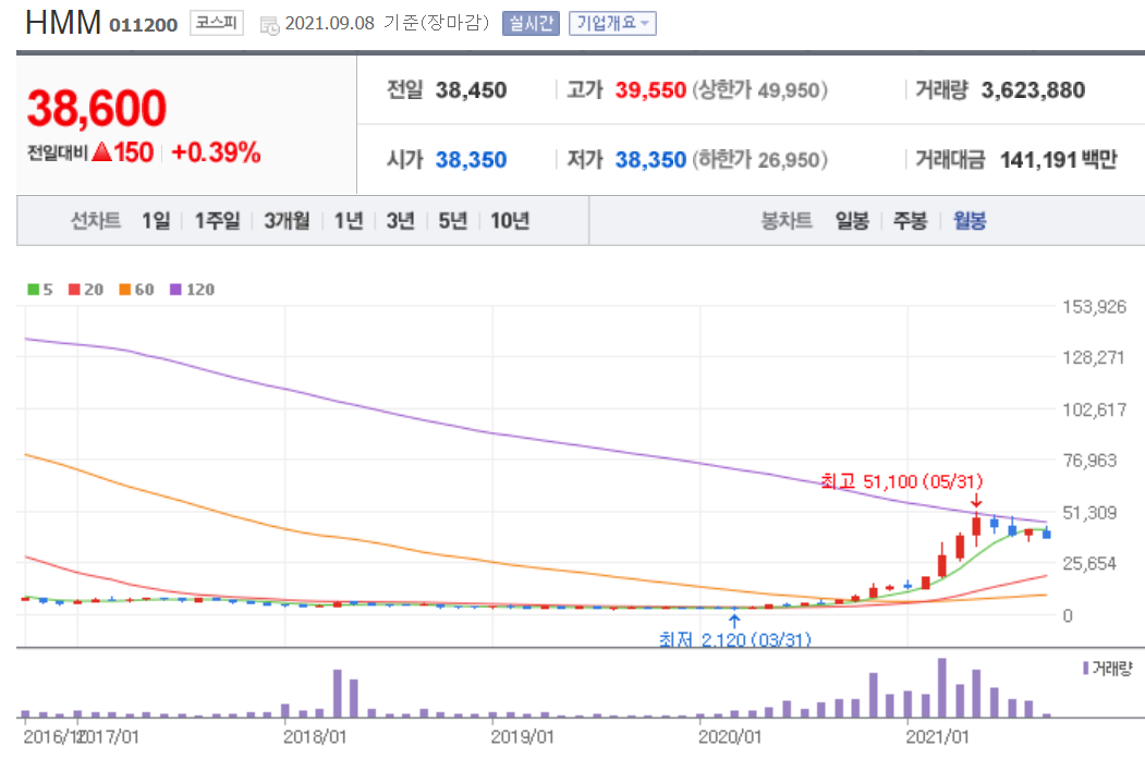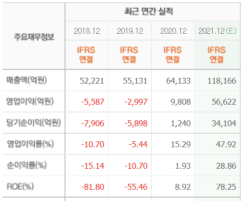 올해 예상 영업이익은 5조 6천억 원입니다. 시가총액은 15조 6천억원 이렇게 3년만 벌면 시가총액이 됩니다. 물론 계속 호황이라는 가정하에 말이죠. 내년까지 선박 운송비의 증가로 HMM도 계속해서 실적이 상승할 것으로 보입니다.