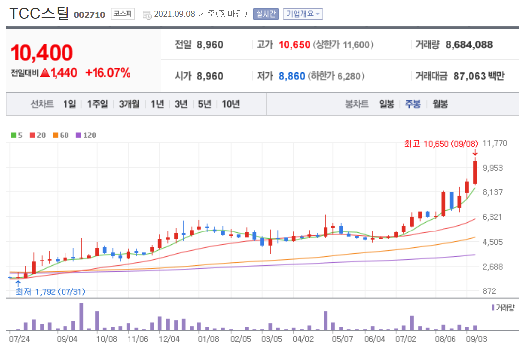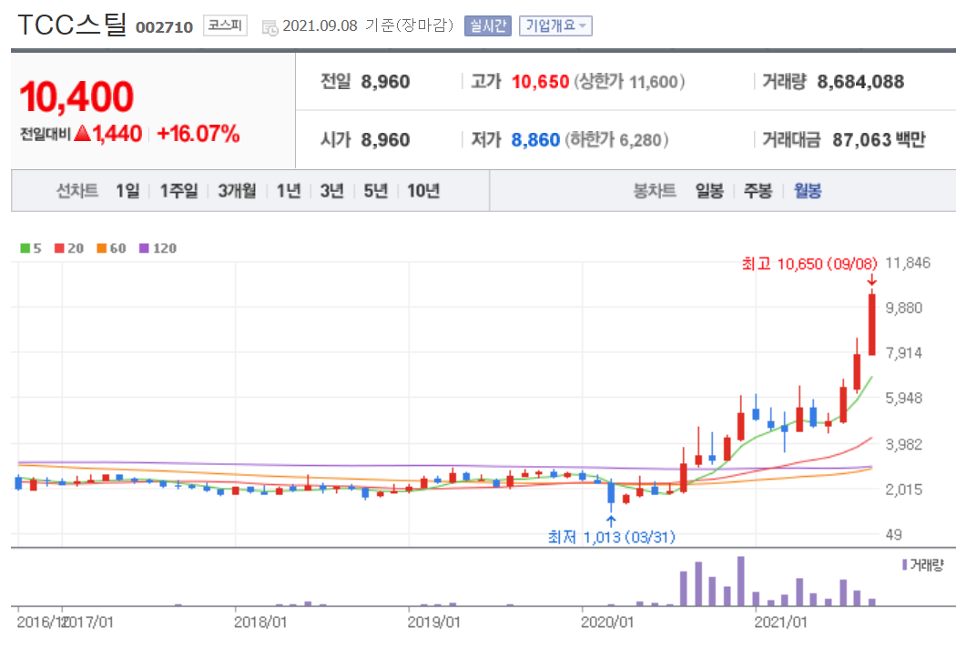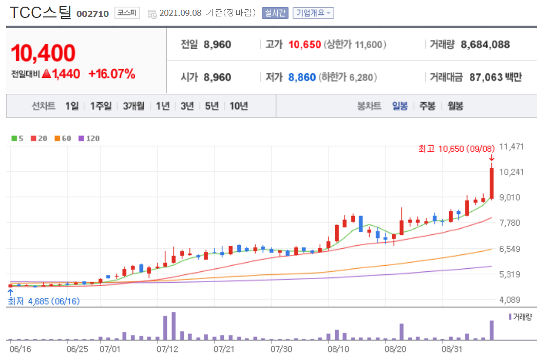그래서 상신이디피의 관련주로 TCC스틸을 유심히 봐야 합니다. TCC스틸의 주가는 이미 엄청나게 급등했습니다. 지금 당장 매수하기보다는 20일선 혹은 60일선을 터치할 때 분할 매수하시는 것을 추천드립니다.