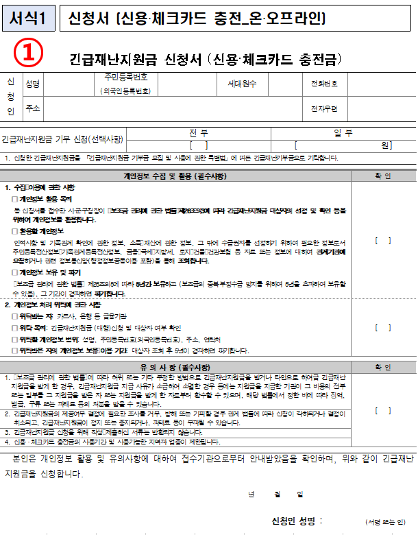 은행 창구로 방문할 경우에는 [서식 1] 신청서(신용/체크카드 충전 온/오프라인)를 작성해야 합니다. 성명과 주민등록번호, 주소 등 정보를 입력하고 아래 개인정보 관련 내용에 동의를 하시면 됩니다.