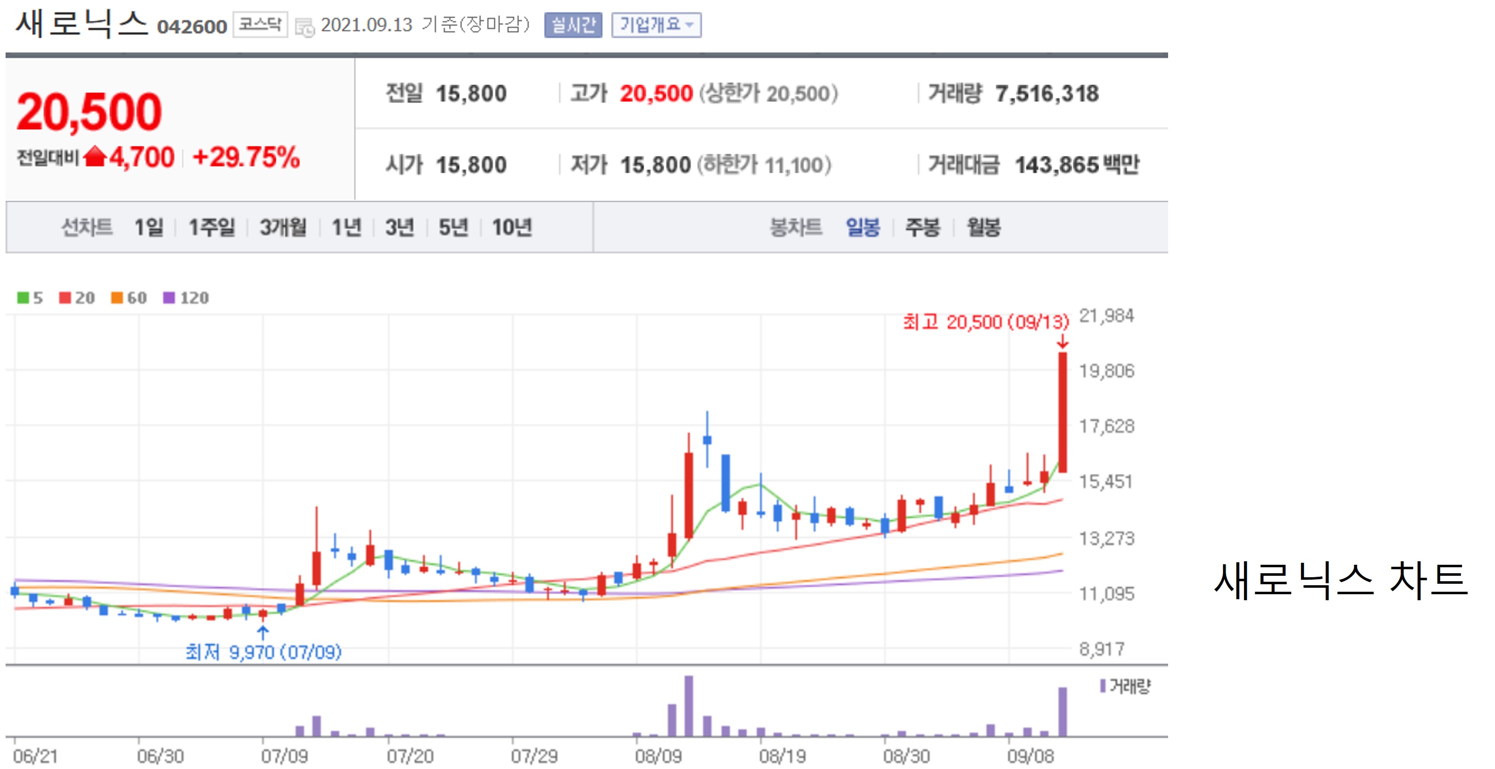 엘앤에프의 주가가 상승할 때 가장 관심 있게 봐야할 종목은 바로 모기업인 새로닉스입니다. 새로닉스는 엘앤에프의 지분 15%를 보유하고 있는 대주주입니다. 엘앤에프의 실적이 좋아질수록 가장 수혜를 받는 기업이 바로 새로닉스입니다. 금일 엘앤에프 급등과 함께 새로닉스도 상한가를 기록했습니다.
