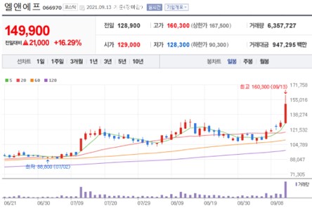 엘앤에프는 오늘 16% 급등을 해서 주가가 다시 하락하기 전까지는 매수를 추천할 수 없습니다. 이미 급등한 종목을 매수한다면 고점에 물릴 수 있기 때문에 항상 조심해야 합니다.