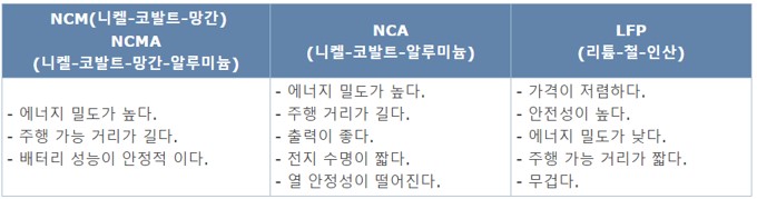NCM과 NCMA의 장점은 LFP 대비 에너지 밀도가 높고, 주행 거리가 늘어나는 장점이 있습니다. 단점으로는 가격이 비싸다는 것입니다. LFP는 중국의 배터리 회사(CATL, BYD 등)에서 주로 사용하는 양극재로 가격은 저렴하지만 에너지밀도가 낮고 주행거리가 짧다는 단점이 있습니다.