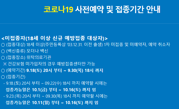 이번 코로나 백신 예약은 만 18세 이상의 모든 국민 중 아직 백신을 접종하지 않는 사람들을 대상으로 진행되며 예약은 9월 30일 저녁 6시에 마감이 됩니다. 이 시기를 놓치면 백신 접종이 어려울 수 있으니 꼭 신청하세요.