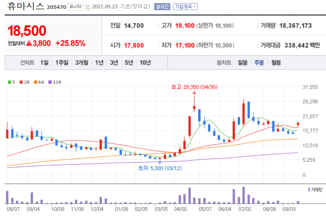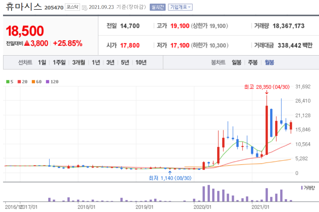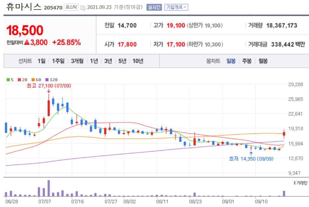 그래서 오늘 이와 같은 이슈로 휴마시스의 주가가 급등했는데요. 많은 분들이 이걸 계속 들고 가야 하나 팔아야 하나 고민이 많으실 겁니다.