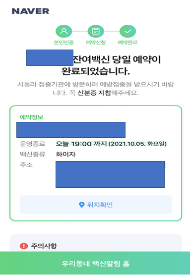 9월 14일에 화이자 백신 1차 접종을 하고 3주 뒤인 오늘 잔여백신 예약을 통해서 화이자 2차 접종을 완료했습니다. 사실 3주 후에 백신 접종이 가능한지 확실하지가 않아서 걱정이 많았는데 화이자의 경우에는 3주 간격으로 접종이 가능한 것을 확인했습니다.