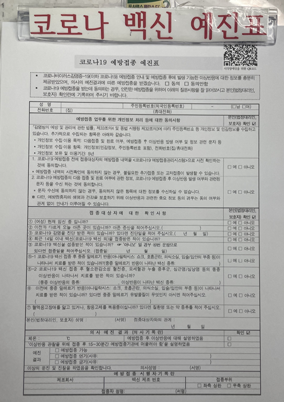 잔여백신을 접종받으러 가니깐 1차 접종과 동일하게 문진표를 작성하라고 하더라고요. 평소 건강상의 문제나 1차 접종 이후에 부작용이 나타났었는지를 확인하는 내용입니다. (아래 참조)