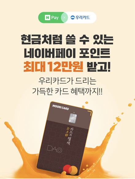 네이버페이에서 우리카드를 발급발을 경우 최대 12만원의 네이버페이 포인트를 받을 수 있습니다.