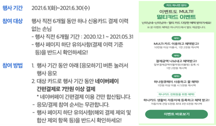 마찬가지로 이벤트 시작일 기준 직전 6개월간 하나카드 사용이력이 없어야합니다.