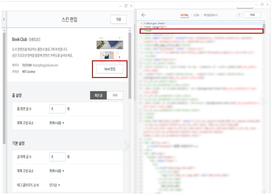 7. 상기 코드를 스킨편집 HTML편집을 이용해 <Head>와 </Head> 사이에 삽입합니다.