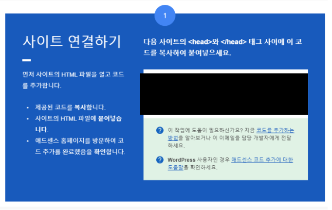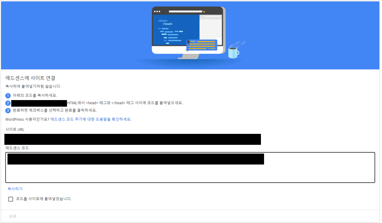 삽입 후 위의 창에서 "코드를 사이트에 붙여넣었습니다."를 체크한다.