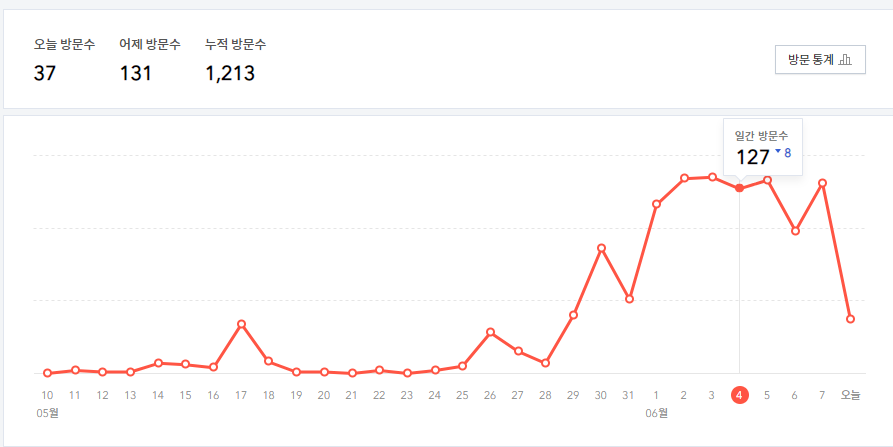 아직 블로그 최적화가 이루어지지 않아서 방문자수는 많지 않습니다. 개인적으로 테스트가 필요해서 이웃도 만들지 않았습니다. 아직 블로그 최적화와 키워드를 찾는데 어려움이 있어서 그런것 같습니다. 블로그 개설후 누적 방문자 수는 1,200명 정도 되네요.