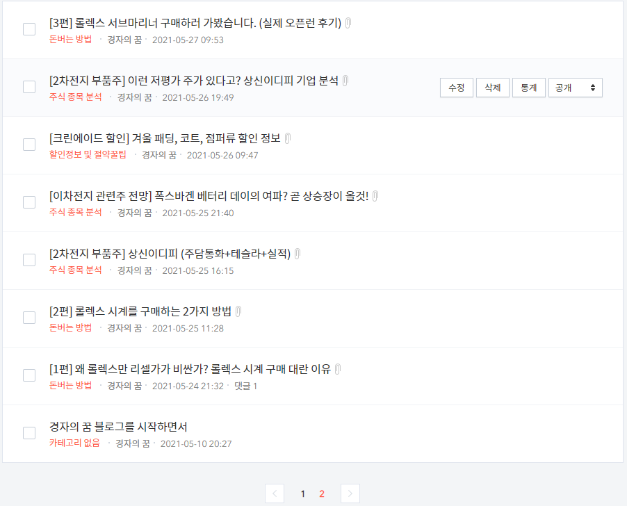 저는 첫 포스팅은 5/11일에 1,000자 넘게 작성하였고, 이후 1일 1포스팅을 꾸준히 해왔습니다. 그런데 개인적인 사정으로 블로그의 주제를 변경하게 되었고 앞에 작성한 글은 5/11일 소개글 빼고는 모두 삭제를 하였습니다. 이후 5/24일부터 경제와 관련된 주제로 블로그 주제를 변경하여 현재까지 작성중입니다.