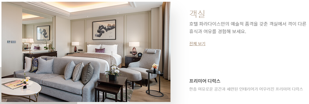 첫번째는 호텔파라다이스입니다. 저도 호텔 파라다이스 프리미어 디럭스 객실에 묵어본적이 있었는데 모던한 인테리어로 구성되어 있고 방도 상당히 넓습니다. 가격은 30만원 수준으로 정말 만족스러웠습니다. 물론 자주갈만큼 제가 경제적으로 여유롭지는 못하지만 이 가격대에서 이정도 룸 컨디션은 파라다이스가 유일한 것 같습니다.