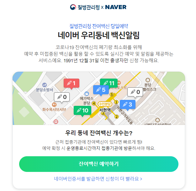 네이버는 질병관리청 정보제공에 따라 접종기관 및 백신 잔여량을 공개하며, 예약신청 정보를 질병관리청으로 전달, 질병관리청에서 배정한 결과를 회원님께 전달하는 중계 역할만 진행합니다