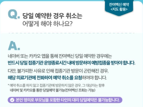 만약 백신접종을 예약했으나 부득이한 사정으로 병원 방문이 불가능한 경우에는 반드시 해당 의료기관에 전화를 하여서 취소를 해야합니다. 전화 취소를 하지 않을 경우에는 다음번 잔여백신 예약이 불가능합니다. 이점 꼭 염두해두시고 신중하게 행동하시기 바랍니다.
