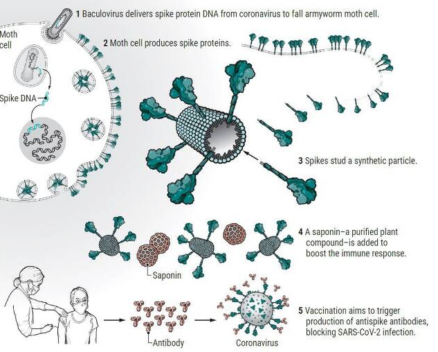 사포닌은 우리에게 익숙한 단어입니다. 바로 인삼의 주요성분이 사포닌이기 때문입니다. 노바백스 백신은 바이러스와 동/식물의 합작품입니다. 노바백스는 코로나 바이러스 스파이크 유전자를 곤충에 감염되는 바이러스에 사이에 먼저 끼워 넣고 이 바이러스가 나방에게 감염되면 그 안에서 스파이크를 대량합성하였습니다. 그리고 노바백스는 이러한 스파이크 단백질을 정제하고 식물에서 추출한 사포닌은 면역증강제로 추가해 백신을 만들었습니다.