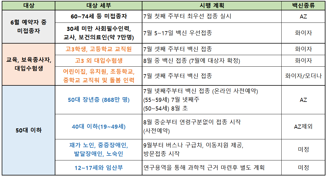 상기 인원에 대해서는 백신의 우선접종권을 부여하여 가장 최우선 접종이 실시됩니다. 고령자(60~74세) 중 미접종자는 7월 첫째주부터 최우선 접종이 실시되고, 30세 미만 사회 필수인력과 교사,, 보건의료인 7만 명에 대해서도 7월 둘째 주에 접종을 완료할 계획입니다.