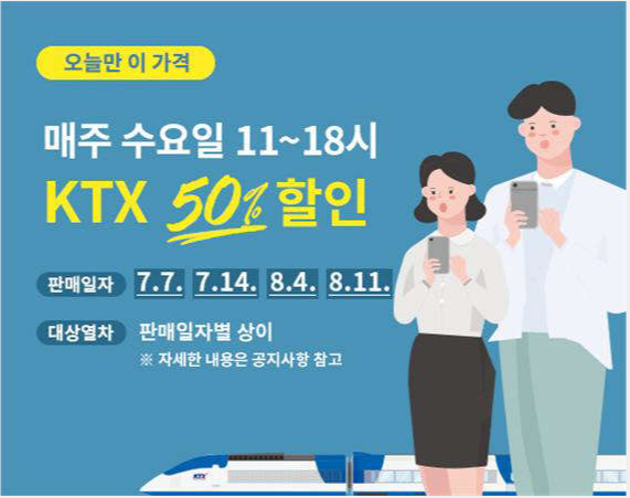 올여름 휴가철인 7월과 8월 사이에 극성수기를 제외한 평일(월~목)에 KTX를 50% 할인받고 구매가 가능합니다. KTX 할인 행사 명칭은 '오늘만 이 가격'입니다.