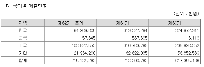 위의 국가별 매출 현황을 살펴보면 60기(2019년)에서 61기(2020년)로 가면서 미국 내 매출이 1년 만에 30%가 증가한 것을 확인할 수 있습니다. 현재 이러한 추세는 계속될 것으로 예상됩니다.