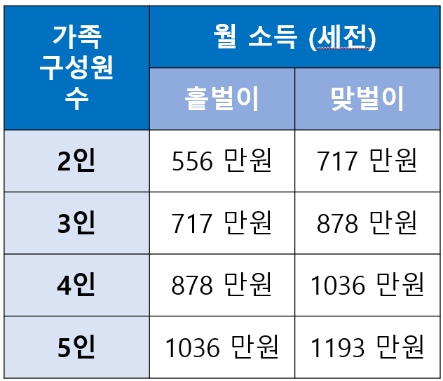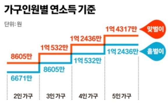 위와 같은 건강보험료를 세전 월 소득으로 환산하였을 때는 홑벌이와 맞벌이 가구는 각각 아래 표와 같이 기준이 산정되었습니다.