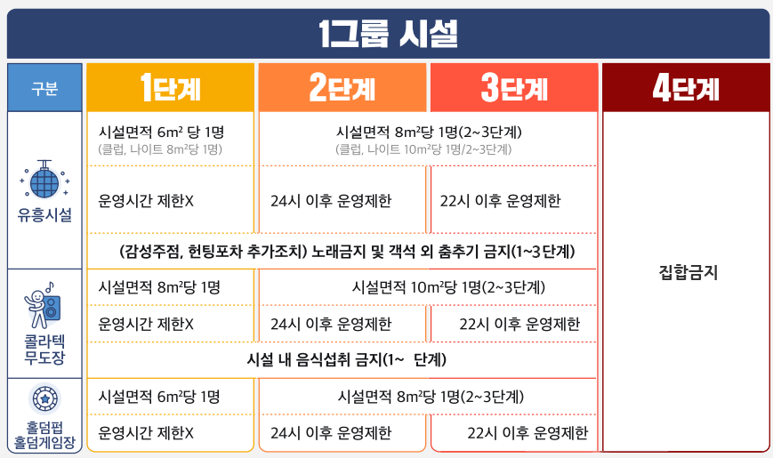 위에 언급된 다중이용시설은 유흥‧단란주점, 클럽‧나이트, 감성주점, 헌팅 포차, 콜라텍‧무도장, 홀덤 펍‧홀덤 게임장, 노래연습장, 식당·카페(포장 배달 가능), 목욕장업, 수영장, 방문판매 등 위한 직접 판매홍보관을 의미합니다.