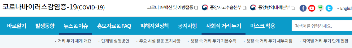 사회적 거리두기 단계가 개편되면서 많은 국민들이 혼란을 겪고 있습니다. 그래서 제가 좋은 사이트 하나를 소개해 드리려고 합니다. 저도 많이 이용하고 있는 사이트인데요. 이 사이트를 참고하시면 실시간으로 사회적 거리두기에 대한 변경사항과 관련 조치 등을 확인할 수가 있습니다. 계속해서 사회적거리두기 조치가 변경되고 있기 때문에 매일 이 홈페이지를 참고해야합니다.