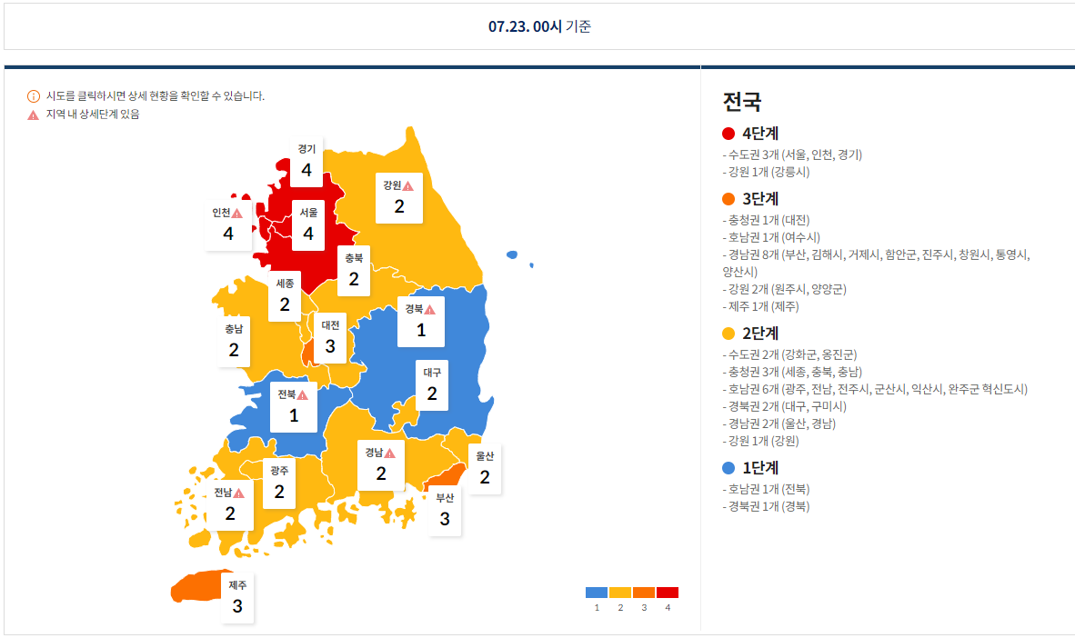 또한, 지역별 사회적 거리두기 단계를 한눈으로 볼 수도 있습니다.