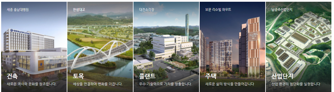 일반인들은 계룡건설이 아파트만 지을 거라고 생각할텐데 이외에도 공공건물, 사무 상업용 빌딩, 문화/스포츠시설, 교육시설과 발전, 에너지 등 산업시설을 건설하고 있습니다. 또한, 플랜트와 토목, 조경 공사까지 다양한 건축, 구조물들을 시공할 수 있는 건설사입니다.