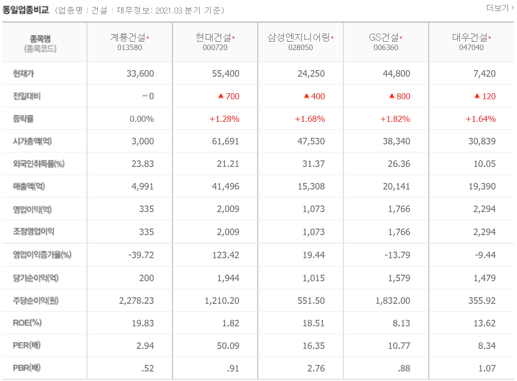 계룡건설이 중형 종합건설사이고 지방에 거점을 두고 있다고 하더라도 PER이 3도 되지 않습니다. (2021.03 기준)