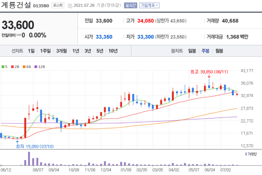 작년대비 올해 계룡건설의 주가가 많이 올라와 있기 때문에 단기 조정에 주의해야 합니다. 현재는 고점 대비 15% 정도 빠져있기 때문에 슬슬 매수할 시기가 아닌가 생각이 드네요.