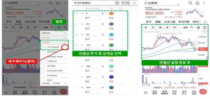 아래 그림과 같이 주기와 선색을 선택하면 차트에 5일/20일/60일/120일 선이 나타나게 됩니다.
