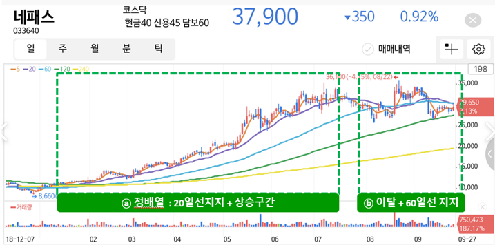 아래 <Fig. 2-1>의 2018년 네패스 주가는 정배열의 적합한 예시입니다.