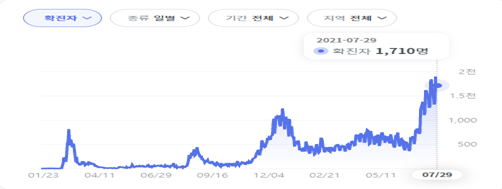 6월 말부터 델타 변이 바이러스가 확산되면서 7월 말 기준으로 1800명에 육박하는 확진자가 매일 나오고 있습니다. 현재 우리나라는 백신 공급이 수월하지 않기 때문에 기회가 주어질 때 백신 접종을 하지 못하면 언제 백신을 접종받을지 모르는 상황입니다.