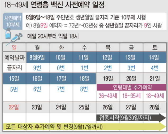 8/19일~21일에는 연령대별 추가 예약이 이루어지고, 8/22일~9/17일까지는 18~49세 전체에 대한 추가 예약과 기존 사전예약에 대한 변경도 가능합니다. 즉, 10부제 예약 미참여자도 코로나 백신 예약이 가능하고, 10부제 예약 참여자도 이후에 개인 사정으로 인한 접종 날짜도 변경이 가능합니다.