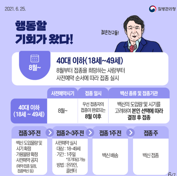 18~49세 가운데 각 지방자치단체에서 우선적으로 접종이 필요하다고 판단한 200만명은 8/17~9/11일까지 전국 예방접종센터에서 우선 접종이 가능합니다.