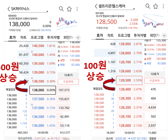 아래 <Fig. 4>을 보면 같은 10만 원 이상의 주가에서 KOSPI 대표주인 SK하이닉스와 KOSDAQ의 대표주인 셀트리온 헬스케어의 1호가 단위의 차이가 있다는 것을 알 수 있습니다.