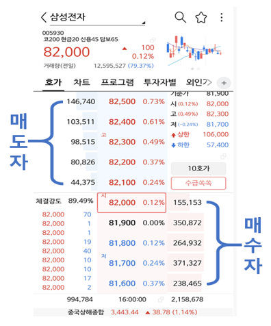 82100원 위로는 매도자가 각 호가에 팔고 싶은 수량만큼 주식을 '매도주문'한 것이고, 82000원 아래로는 매수자가 각 호가에 사고 싶은 수량만큼 주식을 '매수주문' 한 것입니다.