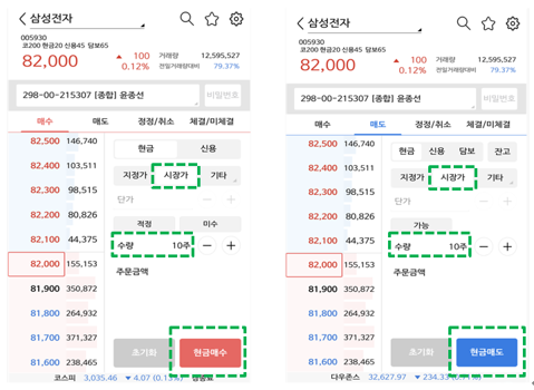 시장가 매매는 아래 <Fig. 3>처럼 매수/매도할 수량을 설정 후에 '시장가' 탭을 누르고 바로 현금 매수/매도를 진행하면 됩니다. 이때 가격은 선택할 수 없고 매수/매도 버튼을 누르는 시점의 현재가로 거래가 되기 때문에 이점 유의해서 거래를 진행하시면 됩니다.
